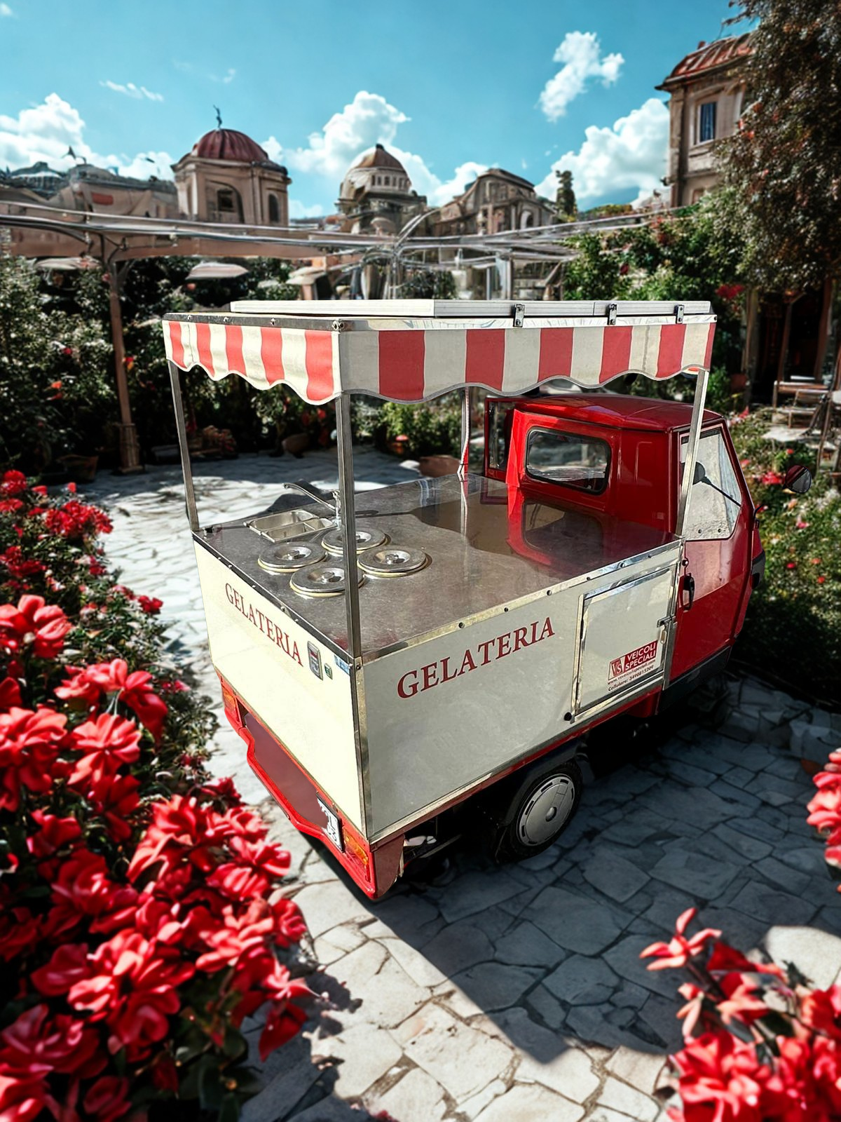 Simbolo dello stile italiano, l'ape car è equipaggiata con un classico tendalino bianco e rosso in tessuto impermeabile. Questo robusto tendalino protegge dal sole delle calde giornate estive, garantendo un ambiente confortevole per i clienti.