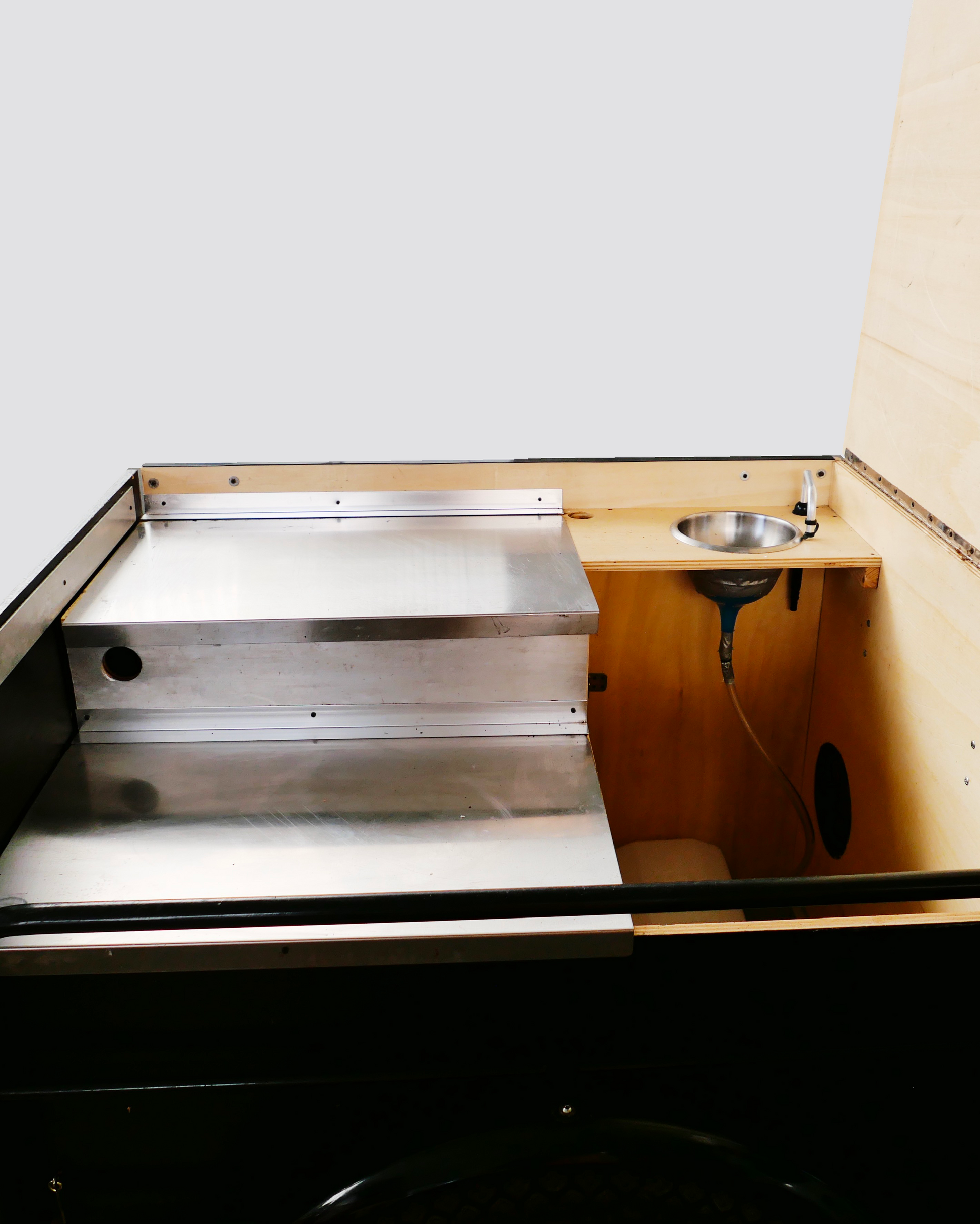 Magazzino Capiente: Sotto il piano di lavoro è presente un ampio magazzino che contiene due contenitori isotermici impilabili dalla capienza di 36 L e due bombole del gas.